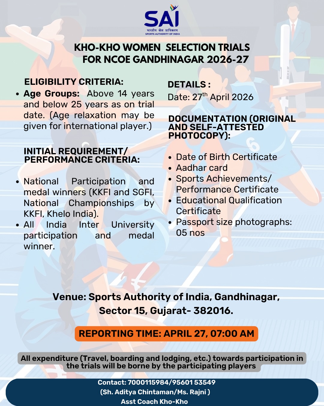 Selection Trials for KHO KHO Women SAI NCOEs Gandhi Nagar year 2026-27, |