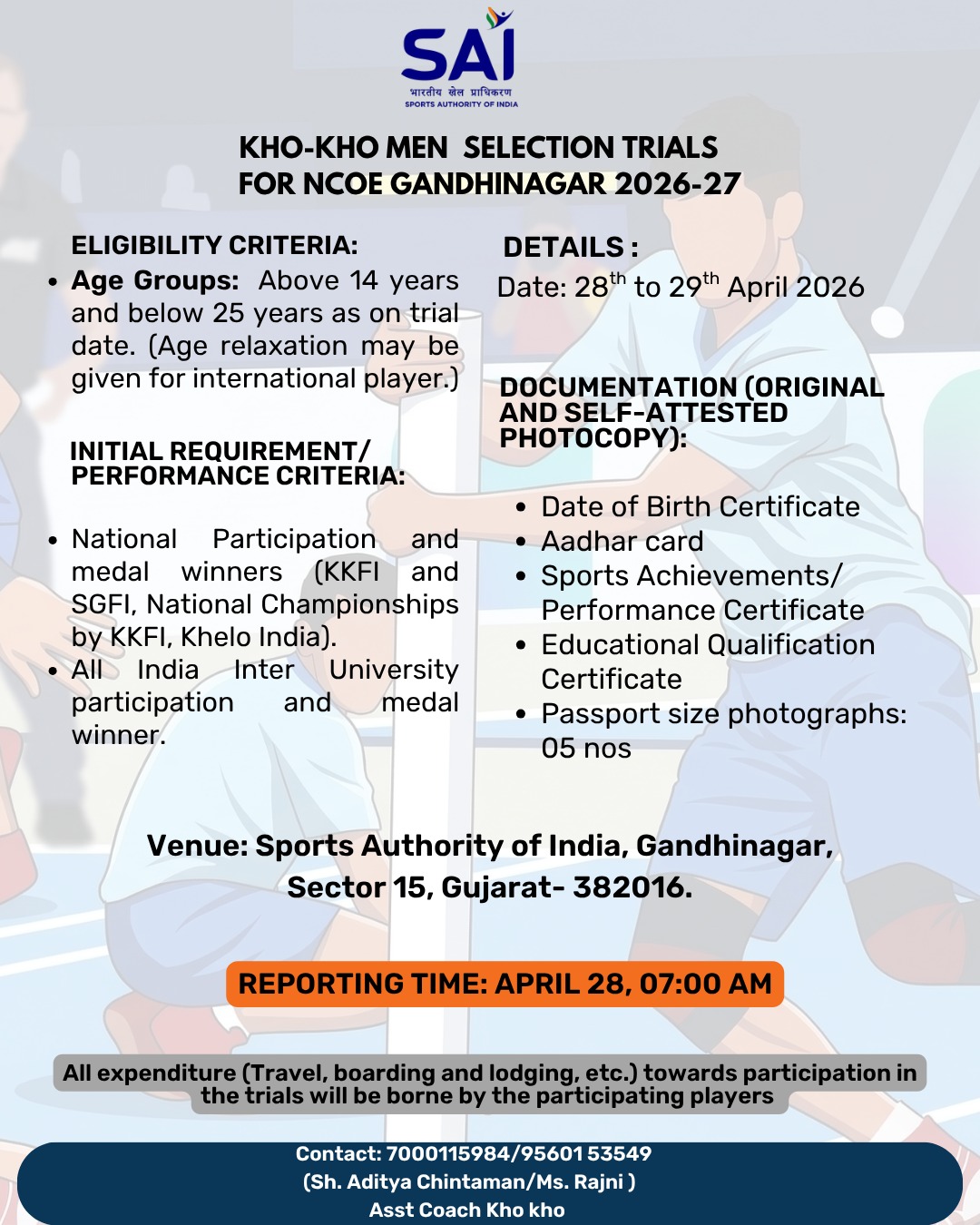 Selection Trials for KHO KHO MEN SAI NCOEs Gandhi Nagar year 2026-27, |